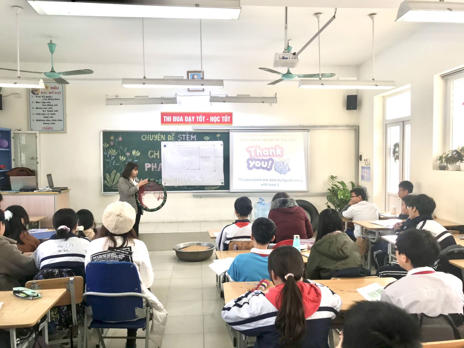 Mở đầu tiết học, học sinh được đặt trước một vấn đề thực tiễn cần giải quyết có liên quan đến kiến thức khoa học đó là thực trạng đuối nước ở nước ta hiện nay. Nhiệm vụ đặt ra cho các học sinh lớp 8A5 là thiết kế những chiếc phao cứu sinh từ các chất liệu tùy chọn. Để giải quyết nhiệm vụ đặt ra, giáo viên đã khéo léo lồng ghép, tổ chức các hoạt động. Trong hoạt động vận dụng, học sinh trực tiếp được lên ý tưởng, chọn nguyên vật liệu, thiết kế, trực tiếp trải nghiệm làm sản phẩm, thử nghiệm và cải tiến làm ra những chiếc phao cứu sinh có tính ứng dụng cao.